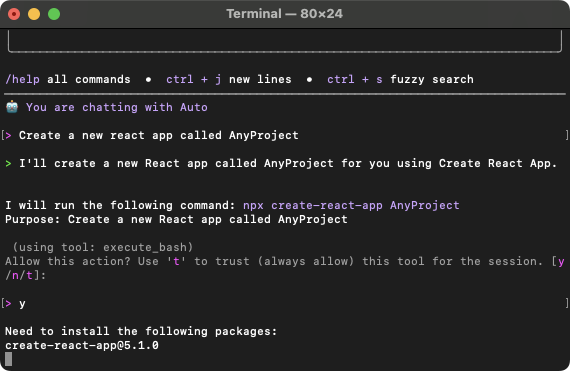 Unleash custom agents in a highly interactive terminal experience. Build features in complex codebases. Automate workflows in seconds. Analyze errors and trace bugs with precision.
