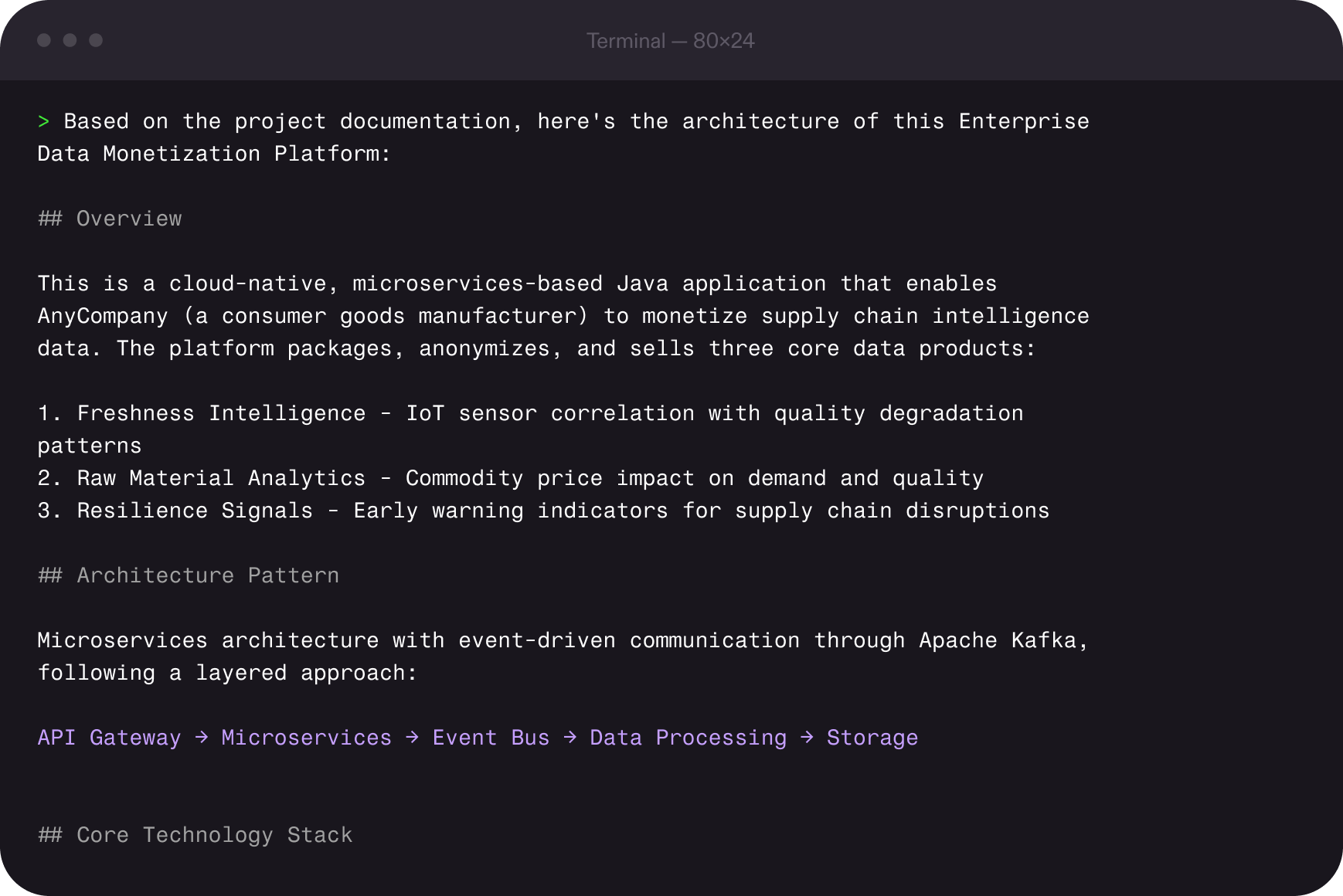 Using your knowledge base, steering files, and MCP tools, Kiro CLI delivers production-grade code, documentation, and tests that match your requirements.