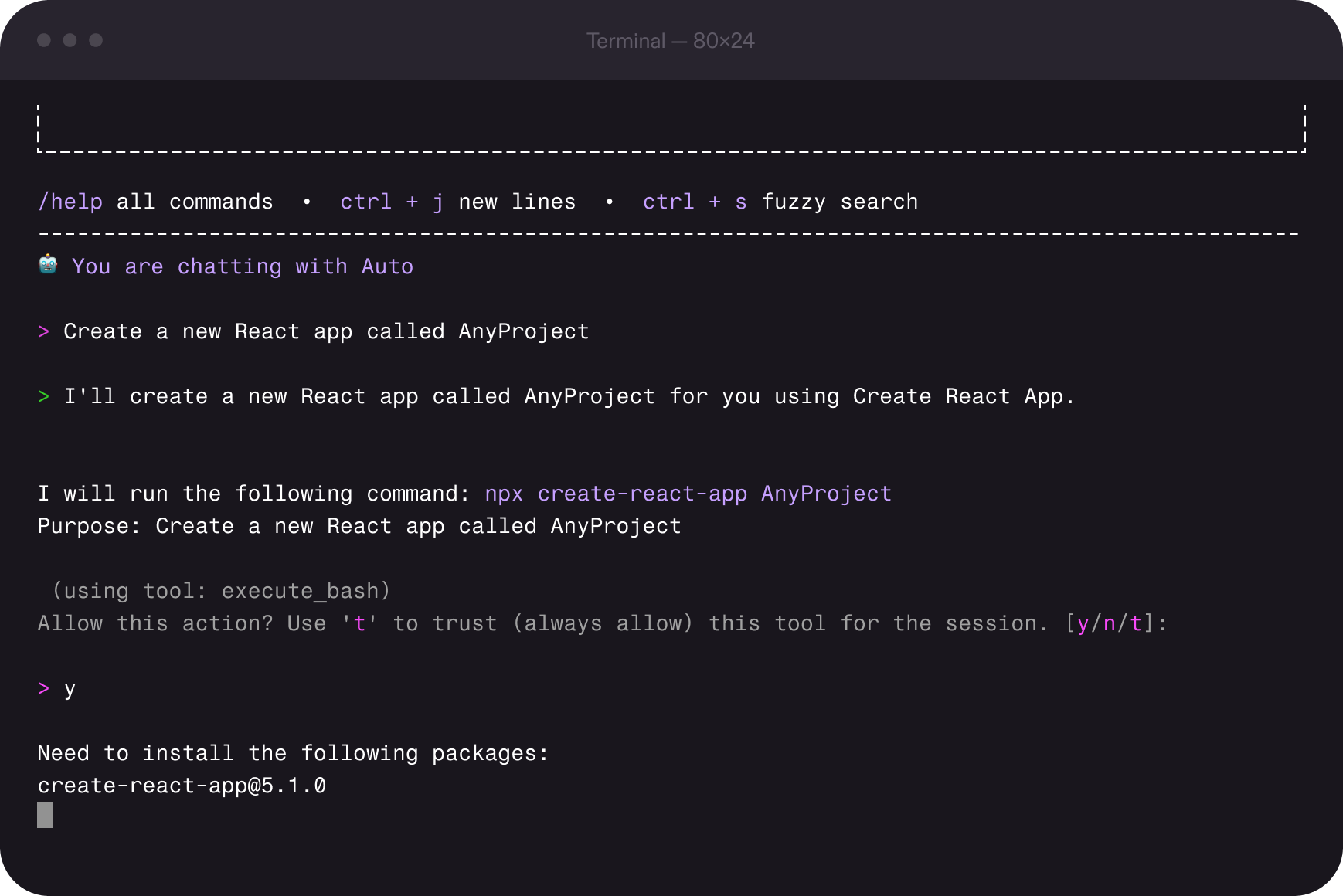 Unleash custom agents in a highly interactive terminal experience. Build features in complex codebases. Automate workflows in seconds. Analyze errors and trace bugs with precision.
