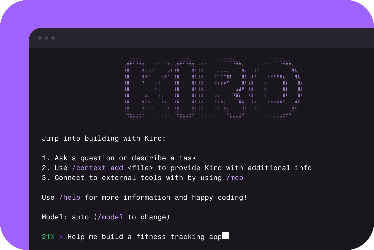 Unleash Kiro agents directly within your terminal to build features in complex codebases, automate workflows in seconds, and analyze errors and trace bugs with precision.