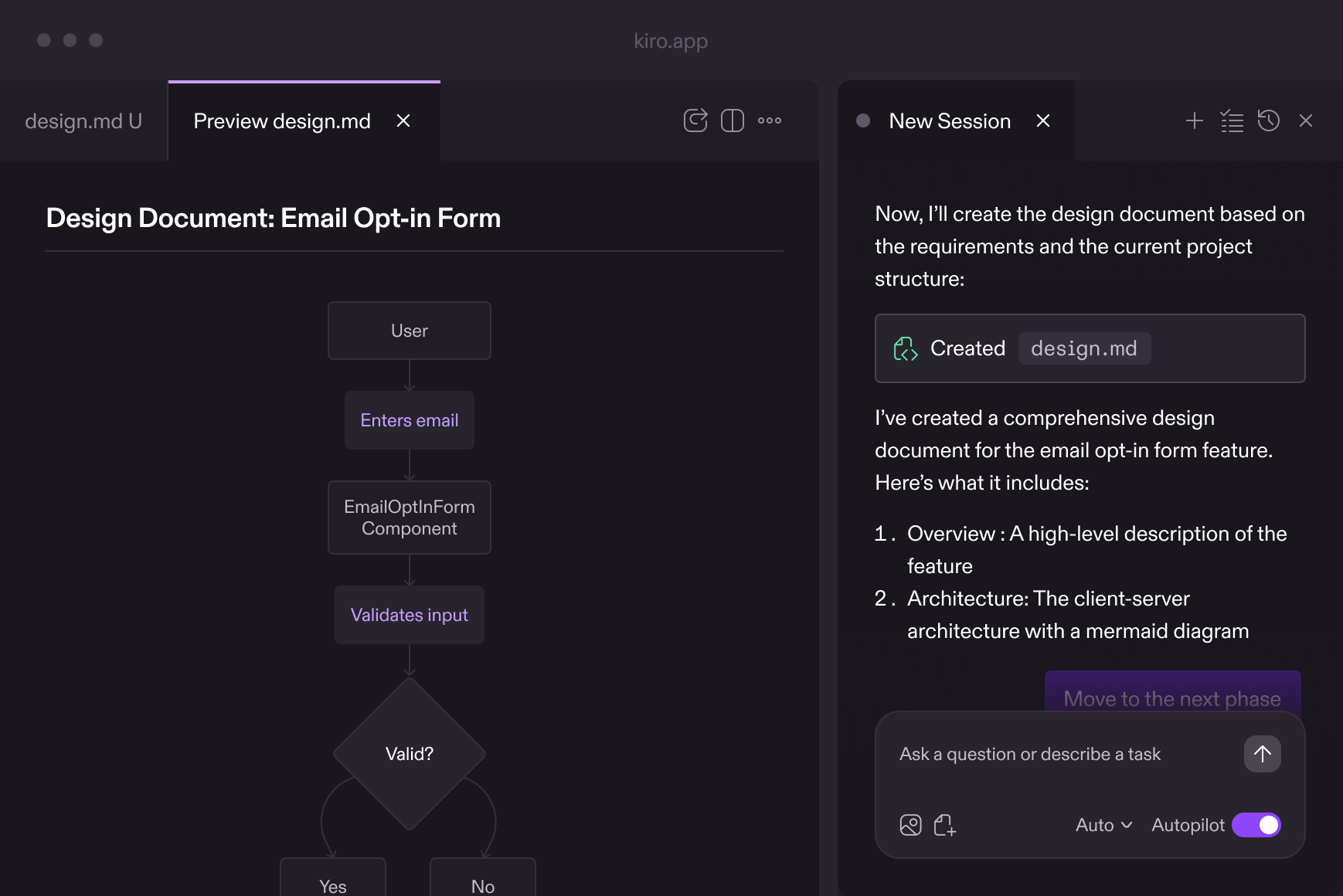 Once you’ve iterated on requirements, Kiro analyzes your codebase and comes up with the architecture, system design, and tech stack that meets your needs.