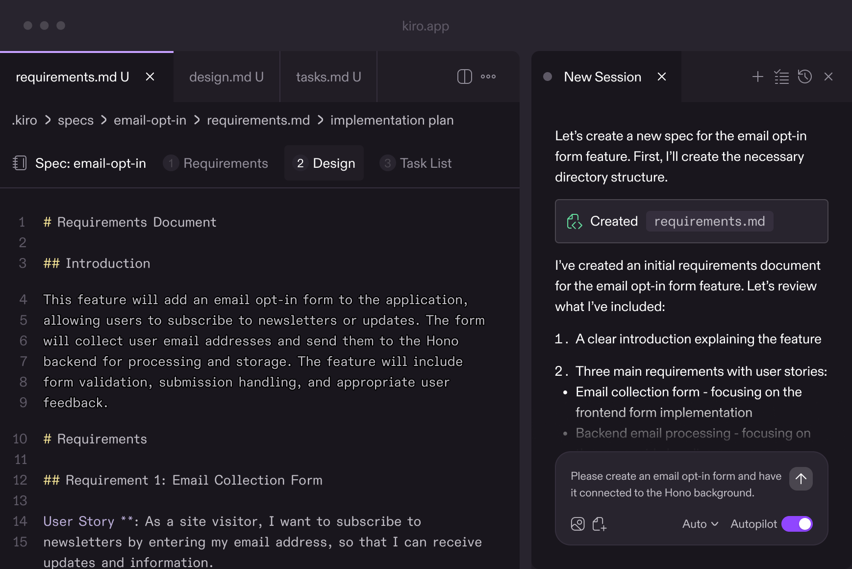 Kiro takes your natural language prompt and turns it into clear requirements and acceptance criteria in EARS notation, making your intent and constraints explicit.