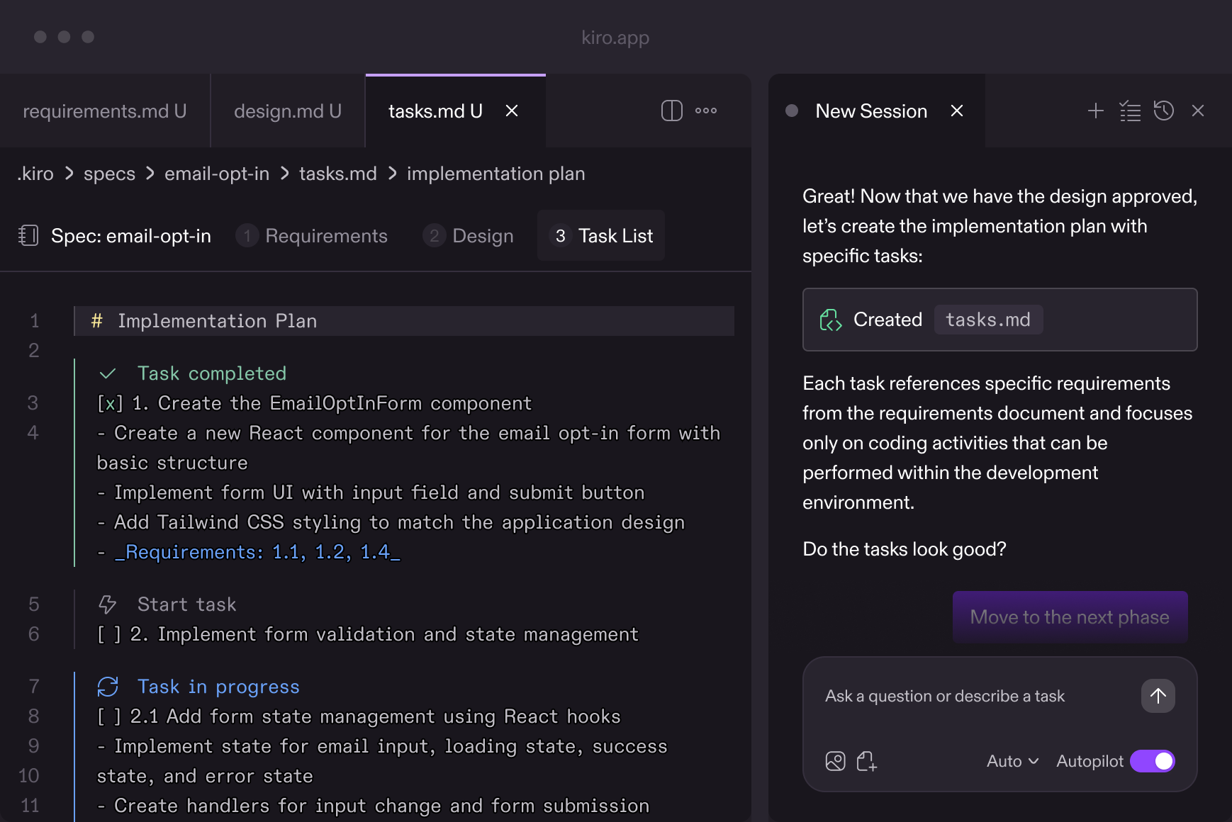 Kiro then creates an implementation plan with discreet tasks, sequenced based on dependencies, with optional comprehensive tests. Ask Kiro to implement each task using advanced agents, and watch the magic happen.